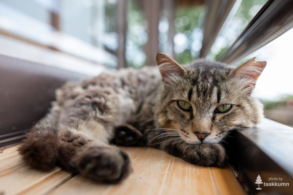 軒先でくつろぐ猫に,広角で寄ってみました。お寛ぎのところお邪魔してすみません…