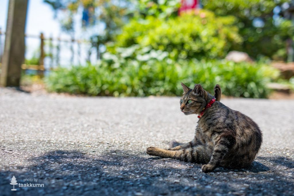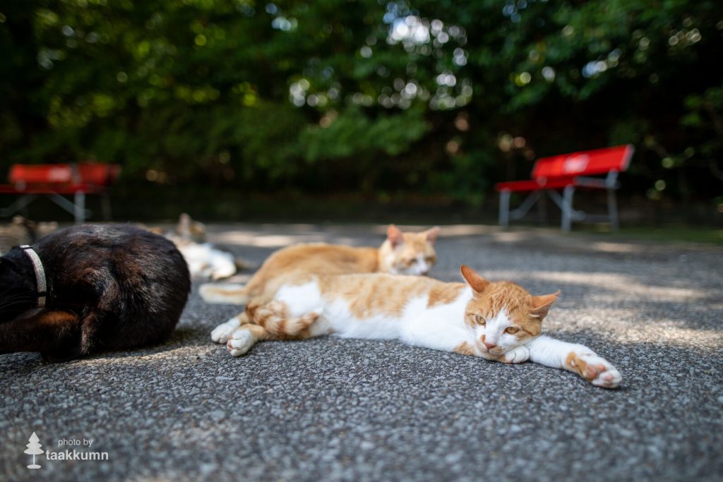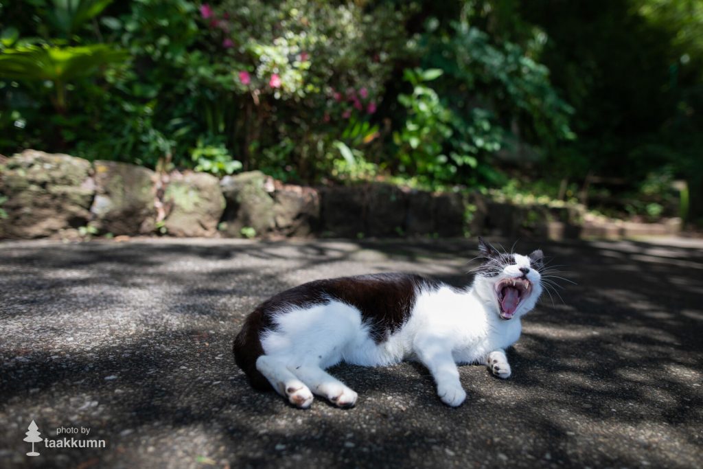撮影日は昨年の2020年6月20日で,季節は初夏。暑い季節に備えて猫の毛並みはすっかり夏毛。冬毛のときと比べてスリムで小柄に見えます。冬は日向に出てくる猫も,暖かくて日差しが強いこの時期はみんな木陰でのんびりしています。今回紹介する写真も,撮影時間がすでに日の高い時間帯ということもあり,すべて日陰や木陰でくつろぐ猫たちです。